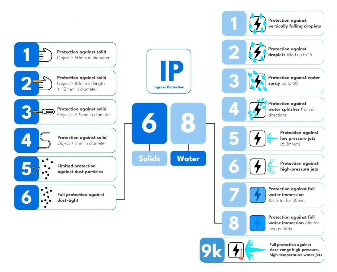 IP는 Ingress Protection의 약자로 '먼지 또는 물의 침입에 대한 보호 강도'를 나타내며 IP 뒤에 따르는 2 숫자가 제품의 보호 수준을 나타내며 숫자가 높을수록 강한 보호 기능을 나타냅니다.